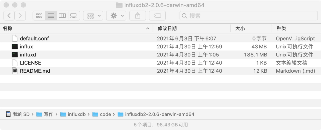 从InfluxDB官网(https://dl.influxdata.com/influxdb/releases/influxdb2-2.0.6-darwin-amd64.tar.gz)下载influxdb2-2.0.6-darwin-amd64.tar.gz安装包,安装包大小约108M。
