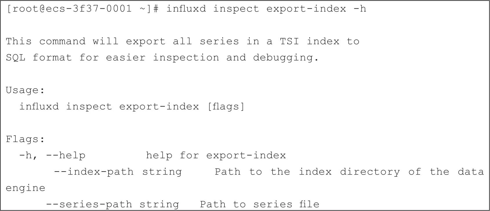 command有两个参数export-index和export-lp,分别是导出TSI索引数据和TSM行协议数据。如需要进一步了解export-index怎么使用,可以使用influxd inspect export-index -h命令查看帮助,如代码清单2-36所示。
