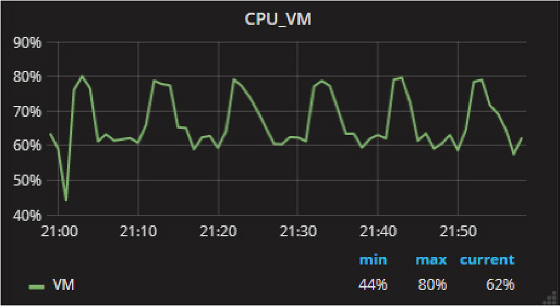 InfluxDB非常适合作为监控系统使用,例如监控CPU使用率。CPU使用率是一个时序数据,横坐标是时间,纵坐标是CPU使用率,如图2-8所示。