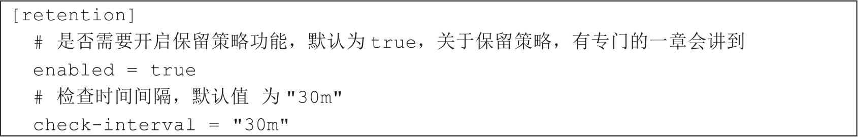 保留策略表示数据默认在数据库中可以保存的时间,一旦超过这个时间,那么历史数据将会被删除。这是为了节省存储空间而设计的,如代码清单2-44所示。