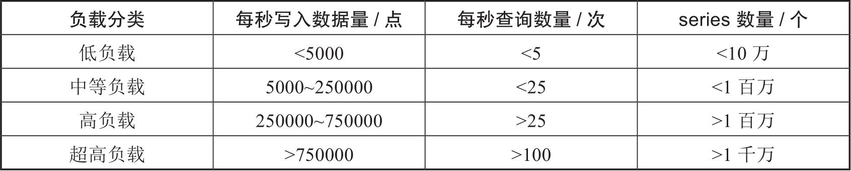 这里定义的InfluxDB的负载是基于每秒写入的数据量、每秒查询的次数以及唯一series的数量(series是一组数据的集合),如表2-1所示。