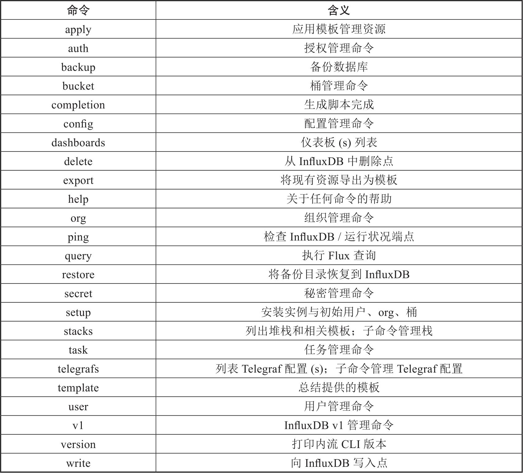 influx内置了一些命令,通过influx help命令可以输出查看,客户端支持的命令都在这里,并且每个关键字后面都进行了解释,还可以通过influx command --help命令,查看某个命令的详细使用以及需要哪些参数及其解释。help命令输出如图4-4所示。