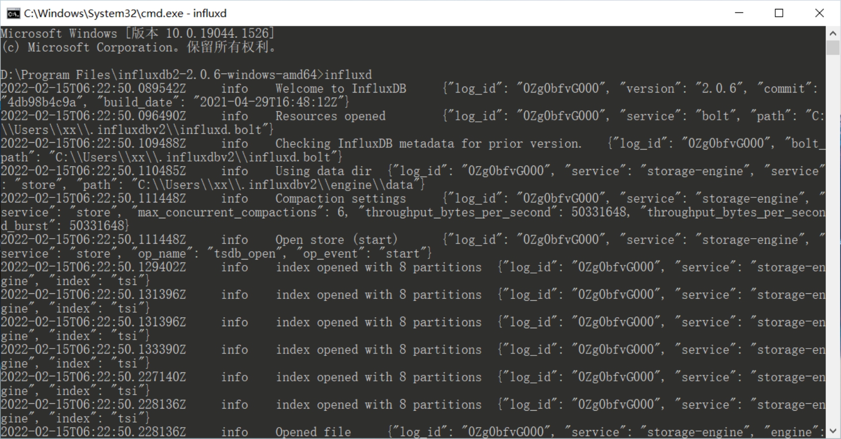 打开CMD,进入InfluxDB目录,输入influxd按Enter键即可启动成功,如图4-1所示。