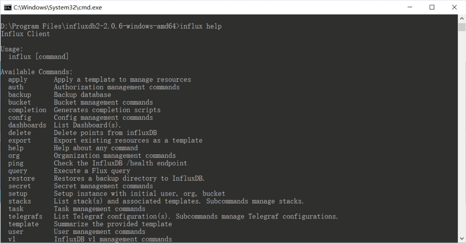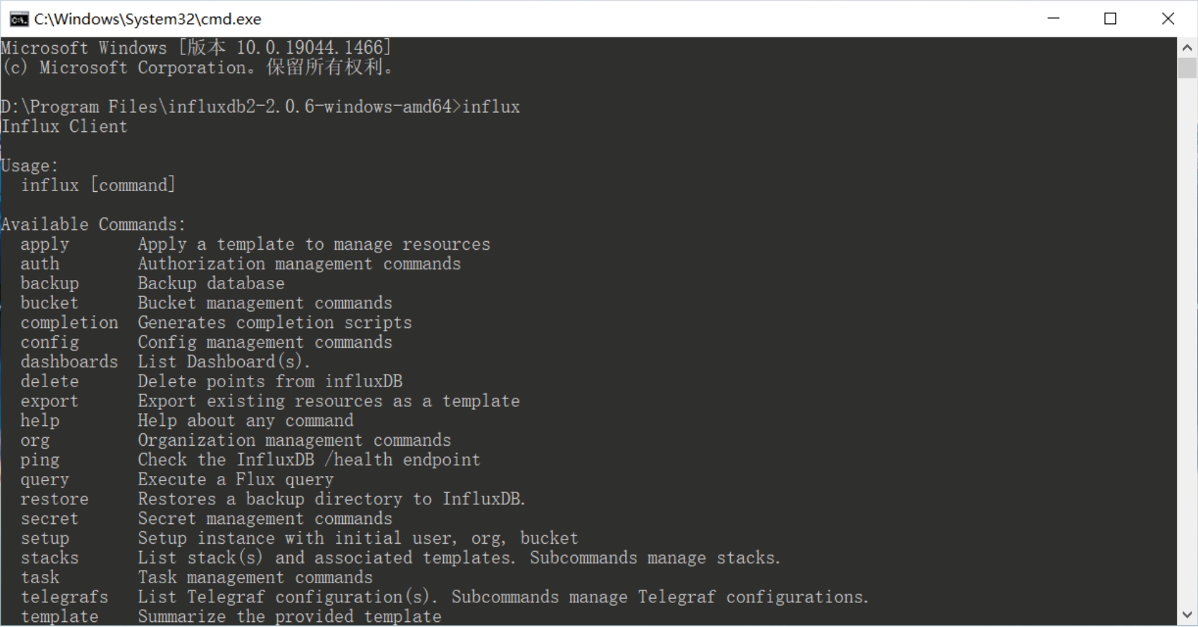 与启动InfluxDB方法一样,打开CMD,进入InfluxDB目录,输入influx按Enter键即可启动,如图4-2所示。