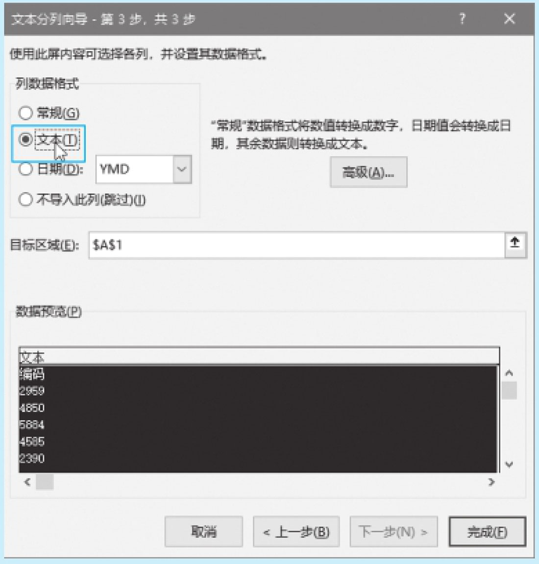 某列的数字编码位数相同,但有的是数字,有的是文本,现在需要把整列数据统一转换为文本格式。此时可以使用分列工具,即在文本分列向导的第3步中选中“文本”单选按钮,如图2-90所示。