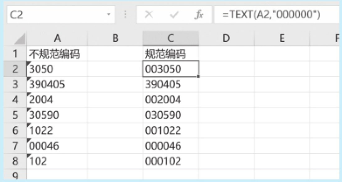 某列的数字编码长度不一,现在需要把这些编码统一为固定位数,位数不够的在前面补足0。此时可以使用TEXT函数将图2-91中A列的数字编码统一为6位,在C2单元格中输入如下公式。