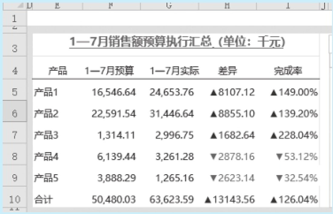 如图2-94所示的表格,就是通过设置单元格格式,突出显示超预算或预算内的差异和执行率,这里,“差异”列和“完成率”列中的数据都是使用公式计算得到的结果,但显示成带上/下角形标记的效果,这里是使用了自定义数字格式。