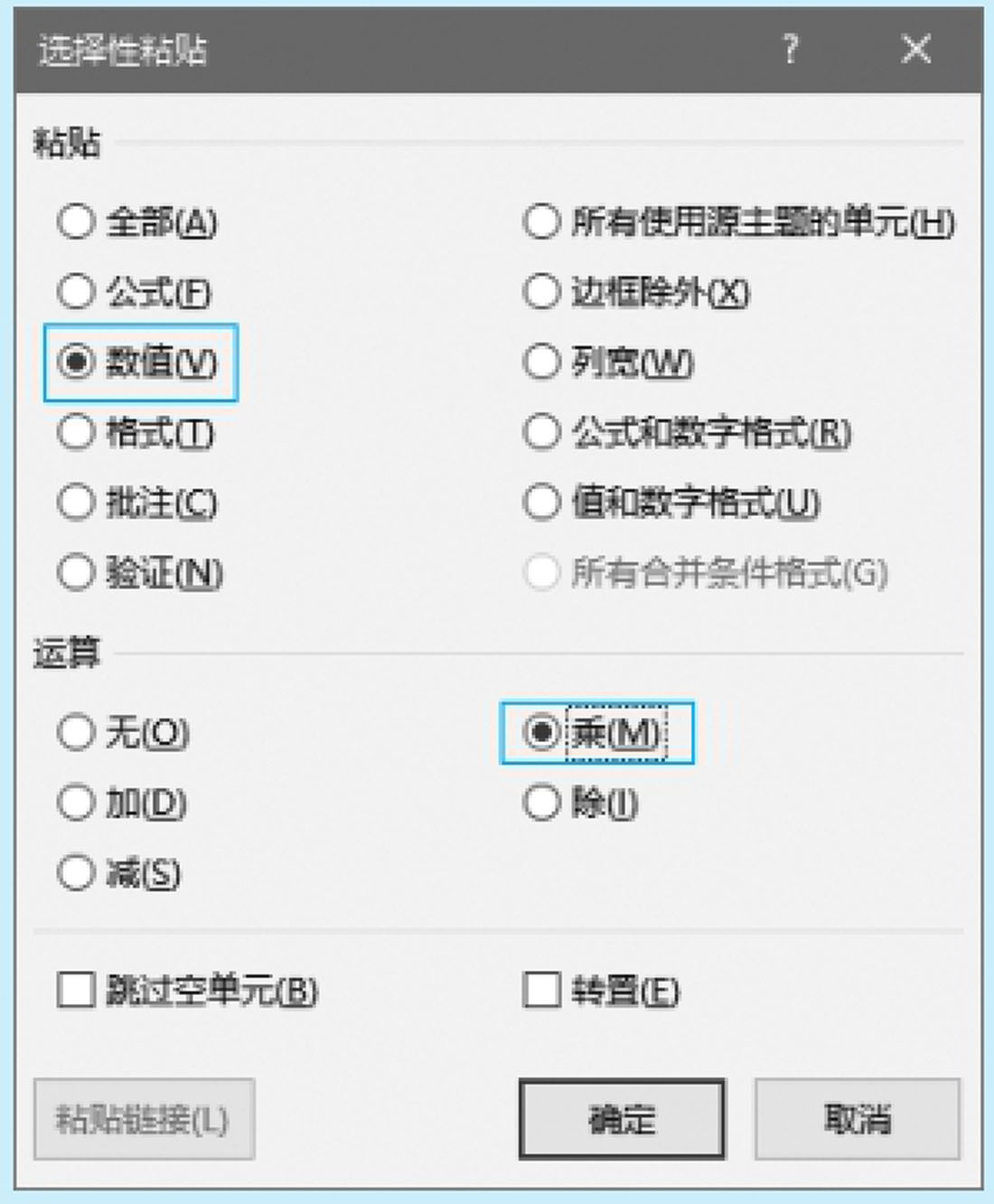 步骤4 打开“选择性粘贴”对话框,选中“数值”单选按钮,并选中“乘”或者“除”单选按钮,如图2-93所示,然后单击“确定”按钮完成设置。