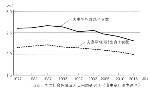 调查结果显示,数据最高值位于泡沫经济破裂前期的1987年,有2.67人;2015年的数据为历史新低,仅有2.32人。结婚4年以内的夫妻的理想子女数只有2.25人,这也是历史最低数据。我们再来看夫妻平均预计生育子女数的调查,数据显示仅为2.0人。通过比对可以看出,夫妻平均理想子女数的数据已经显示出少子化问题的严峻性,而夫妻平均预计生育子女数的数据更加凸显了人们的迫不得已和在现实中的无可奈何。