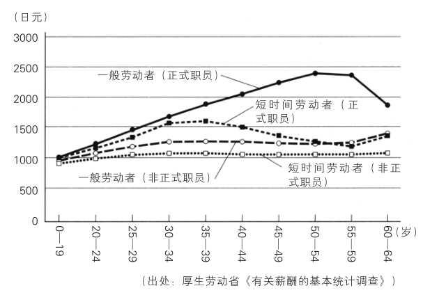 厚生劳动省对全职劳动者中正式职员和非正式职员的工资差额(以2017年的薪酬为例)进行了调查,40岁至44岁的非正式职员,时薪为1294日元,为正式职员的63%;45岁至49岁的非正式职员,时薪为1270日元,为正式职员的56%;50岁至54岁的非正式职员,时薪为1259日元,为正式职员的52%。随着年龄的增加,差距逐渐拉大。
