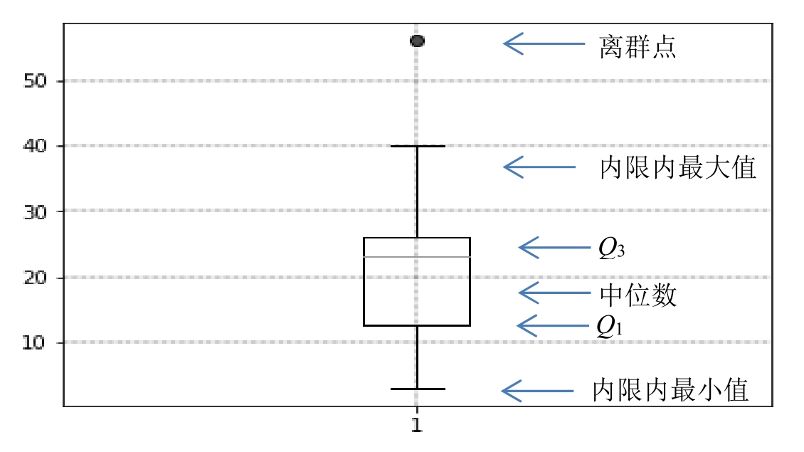 一般在五数箱图中内限内最小值不小于 Q 1 -1.5×IQR,内限内最大值不大于 Q 3 +1.5×IRQ。在内限内最小值到内限内最大值范围以外的数据称为离群点。