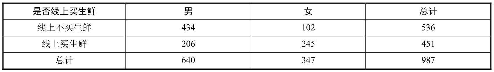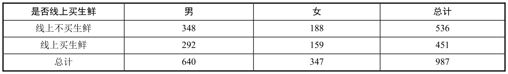 【例2-6】我们要观察性别和网上购物有没有关系。对987名顾客进行调查,结果如表2-4所示。那么,怎么判断线上买不买生鲜与性别有没有关联呢?