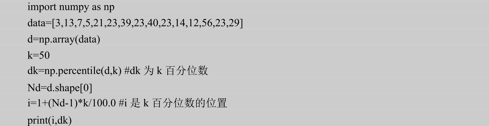 在一组数据从小到大排序,并计算相应的累计百分比时,处于 k %位置的值称为 k 百分位数(Percentile)。 k 百分位数是这样一个值,它使得至少有 k %的数据项小于或等于这个值,且至少有(100- k )%的数据项大于或等于这个值。前面介绍的中位数就是50百分位数。