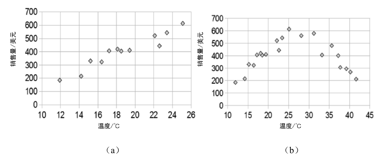 在图2-3(a)中(销售量,温度)协方差是大于0的,说明这两个属性是正相关的。但是在图2-3(b)中(销售量,温度)协方差是等于0的,按照协方差规律,这两个属性是不相关的。显然根据数据分布情况,这两个属性是相关的,先是正相关,超过一定温度后呈现负相关,所以图2-3(b)显示的两个属性之间是存在非线性相关的,此时,用协方差结果来评判是不客观的。