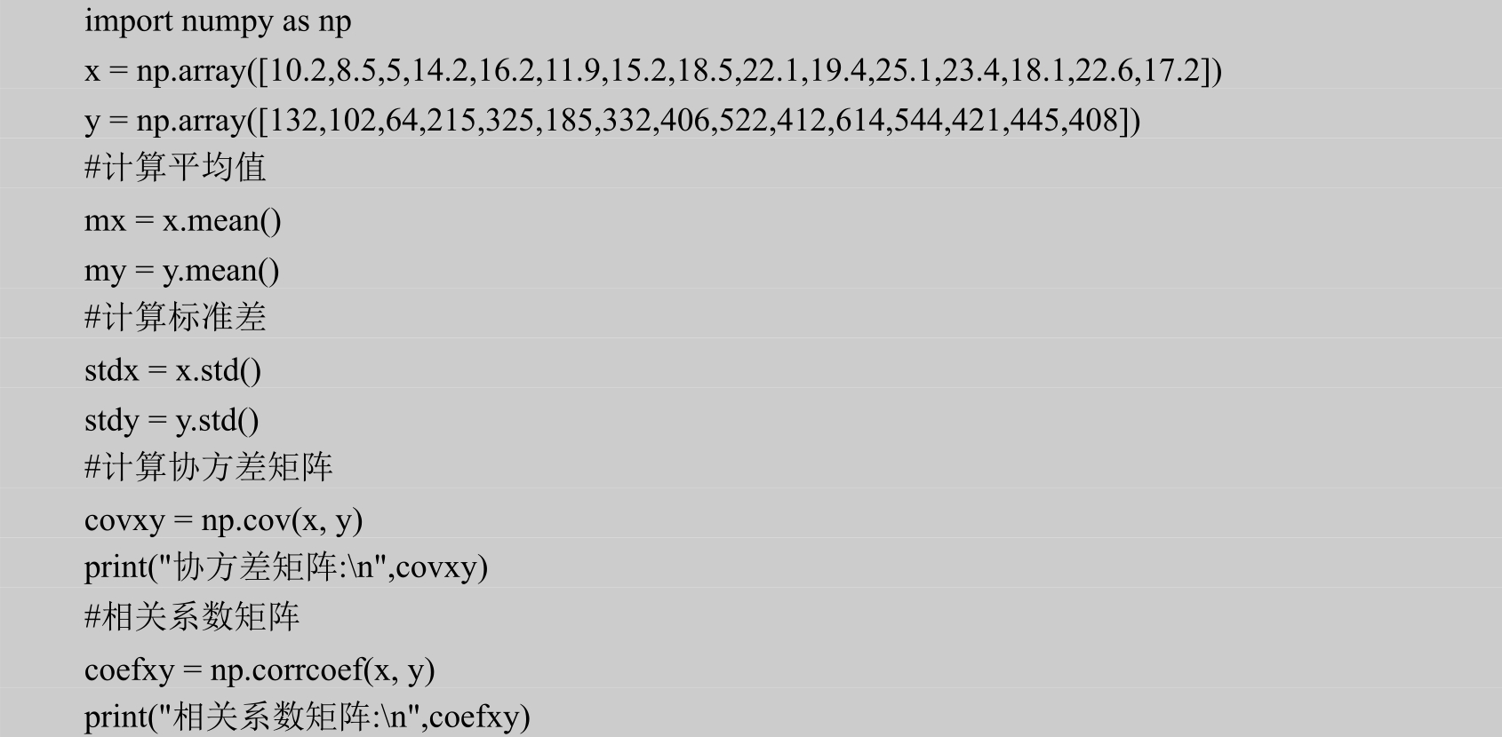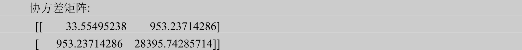 由运行结果显示,Cov( X , Y )=Cov( Y , X )≈953.2371, r(X , Y )= r(Y , X )≈0.9766,无论协方差还是相关系数,其值都是大于0的,说明温度和冰淇淋销售量两者之间存在正相关,但是相关系数是0.9766,是接近1的,更能说明温度和冰淇淋销售量两者之间是存在很强的正相关性的。读者也可以手动计算协方差和相关系数进行验证。