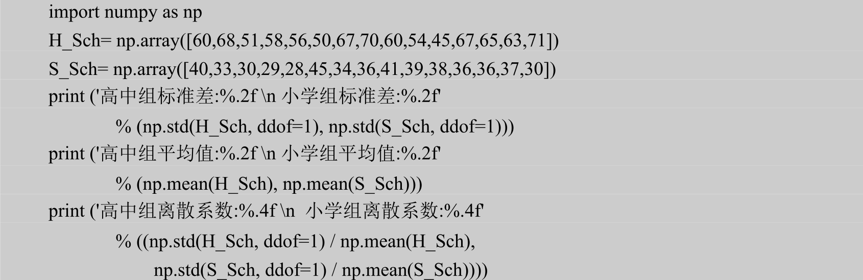 从这个统计数据结果可以看到,高中生体重和小学生体重的平均值相差很大,标准差不能作为比较高中生体重和小学生体重离散性的衡量参数。这时用离散系数来作为衡量参数是比较合理的,通过比较,说明小学生体重离散性更大些。