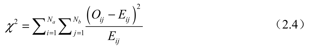 式中, O ij 表示 A 和 B 属性的配对值( A i , B j )的实际观测值; E ij 表示 A 和 B 属性的配对值( A i , B j )的理论值,卡方检验说明了理论值和实际观测值的偏差程度。卡方值越大,偏差越大;卡方值越小,偏差越小;卡方值为0,则理论值和实际观测值完全符合。