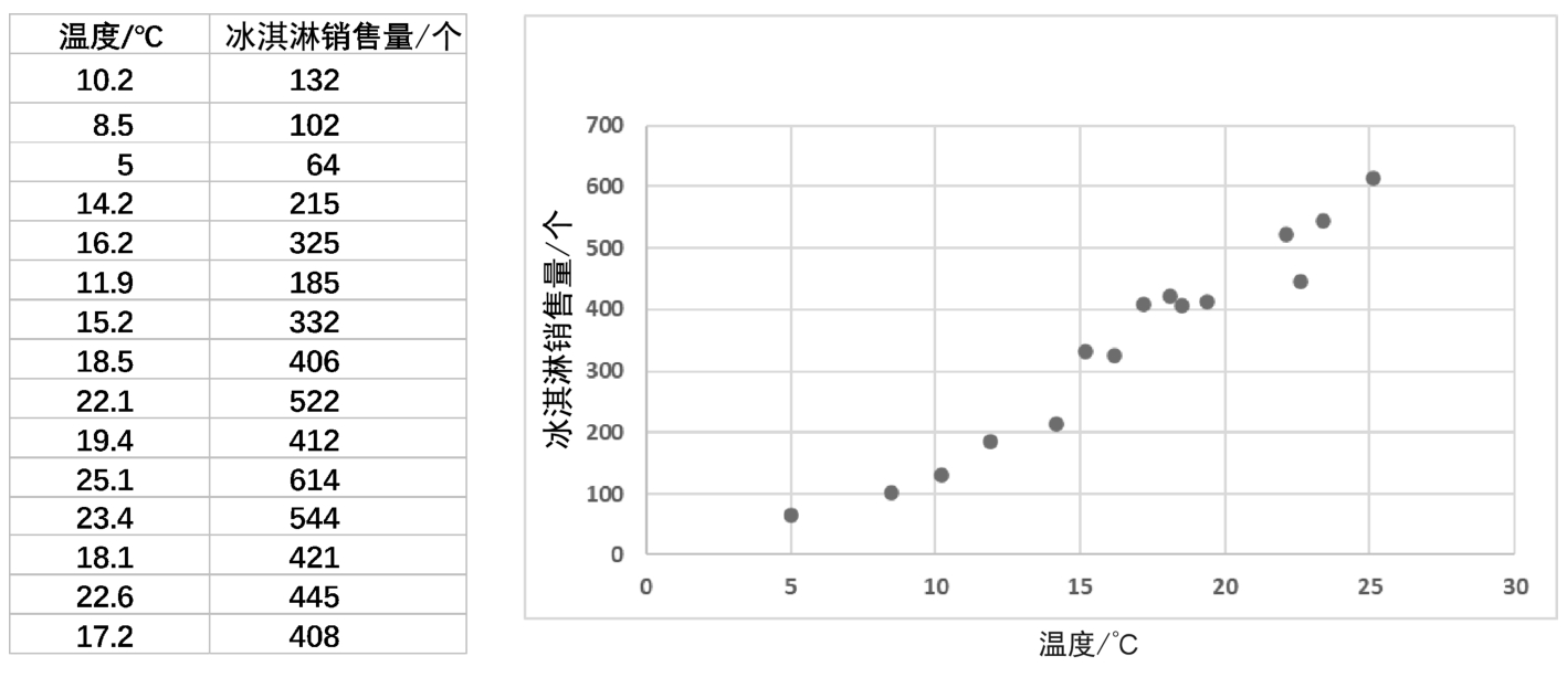 【例2-8】冰淇淋销售量和温度的统计数据如图2-4中左侧的表格所示,图2-4右侧是数据分布散点图,用Python程序计算销售量和温度两个属性的协方差和相关系数。