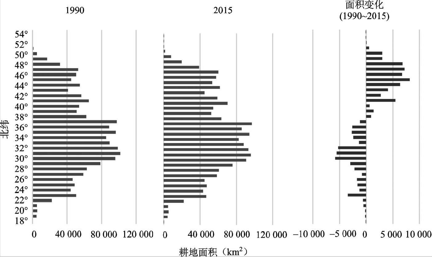 1990~2015年中国耕地的变化特征为:以北纬38°线为界,南减北增(图1–1),总量基本持衡;新增耕地的重心逐步由东北向西北移动(徐苏等,2017);东部和中部地区耕地持续减少;东部地区耕地减少放缓,其中,东北、华北、华中、华东及华南地区的省份耕地减少较多;东北和西部地区耕地持续增加,特别是西北、西南地区,耕地增加较多。一些研究表明,耕地面积向着高纬度地区增加(44.0°N~47.5°N),导致中国耕地生产重心向北移动(Liu et al., 2013)。中国从2000年到2014年,北方耕作面积质心向北移动了310千米(从41.16°N到43.70°N)。东部地区的耕地减少主要是由于建设用地的占用(刘涛等,2018)。中部地区的耕地减少主要是受“中部崛起”战略和国家生态保护工程实施的影响下的建设用地大规模扩张与退耕还林还草(李全峰等,2017)。尽管西部地区的黄土高原、四川盆地等地区由于退耕还林还草等生态工程的实施导致耕地有一定数量的减少,但在新疆,由于绿洲农业的发展,周边耕地大量开垦,且耕地开垦强度和面积远大于西部地区中退耕还林还草工程的强度和范围,因此部分西部地区的耕地呈现大幅增加的特征(刘纪远等,2018)。