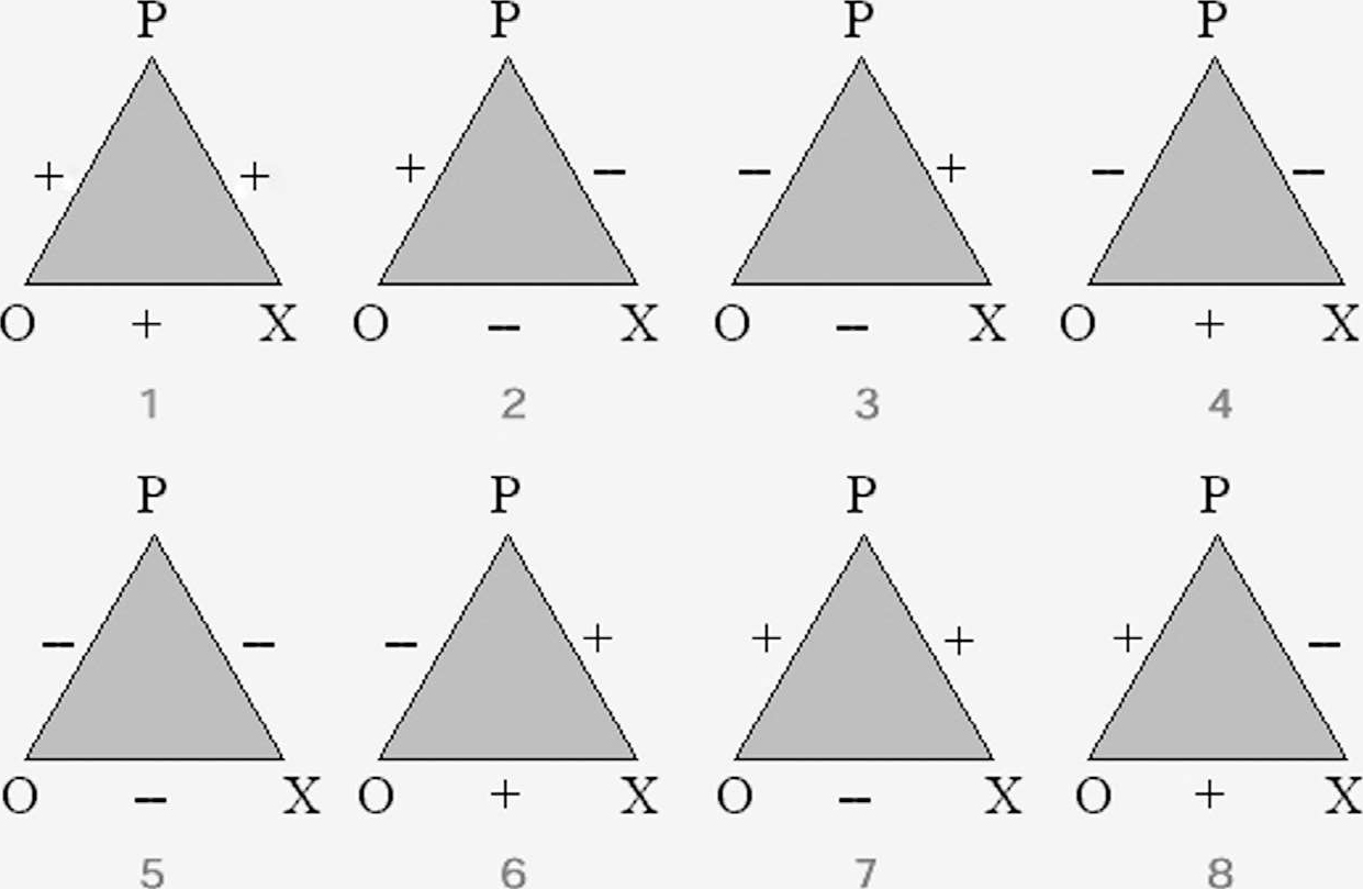 现将上述的P—O—X的关系列成图解形式,以符号“+”表示正的关系,以符号“-”表示负的关系,那么,共有8种状态,其中4种是平衡的结构,4种是不平衡的结构(见下图)。
