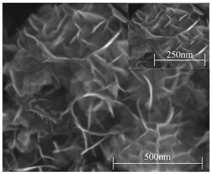 图2-7所示为氧化镍的扫描电镜图。由图可知,NiO是由薄片堆积而成的花球状,直径为500nm左右。这种结构有利于材料与电解液的接触,可提高电极材料的比表面积,使其能够与电解液充分地浸润。