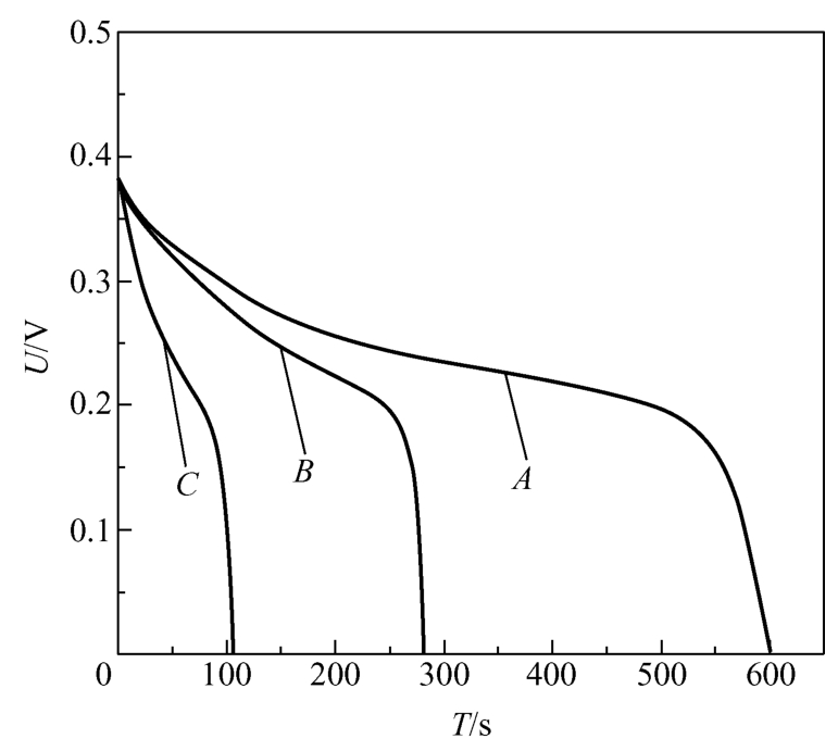 图2-10 氧化镍电极的恒流放电曲线( A =5mA; B =10mA; C =20mA)