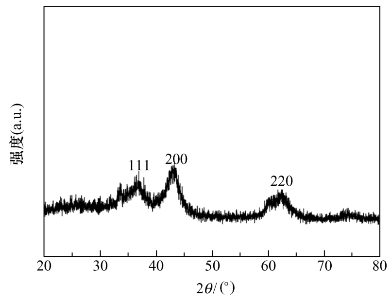 图2-8所示为氧化镍的XRD图谱,由图可见无杂质峰出现,仅在37.3°、43.3°和62.9°处出现衍射峰[对应(111),(200)和(220)],而且由62.9°峰较宽和花球状形貌可推测此晶体为44~1159。除了在2 θ =37.3°处有一强峰外,其余的衍射峰强度均较小,半峰宽较大,表明晶化程度较小,有研究表明结晶程度小的材料更适用于超级电容器电极材料。