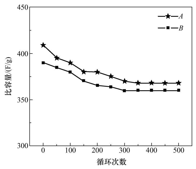 图2-11 氧化镍电极的循环性能( A =5mA; B =10mA)