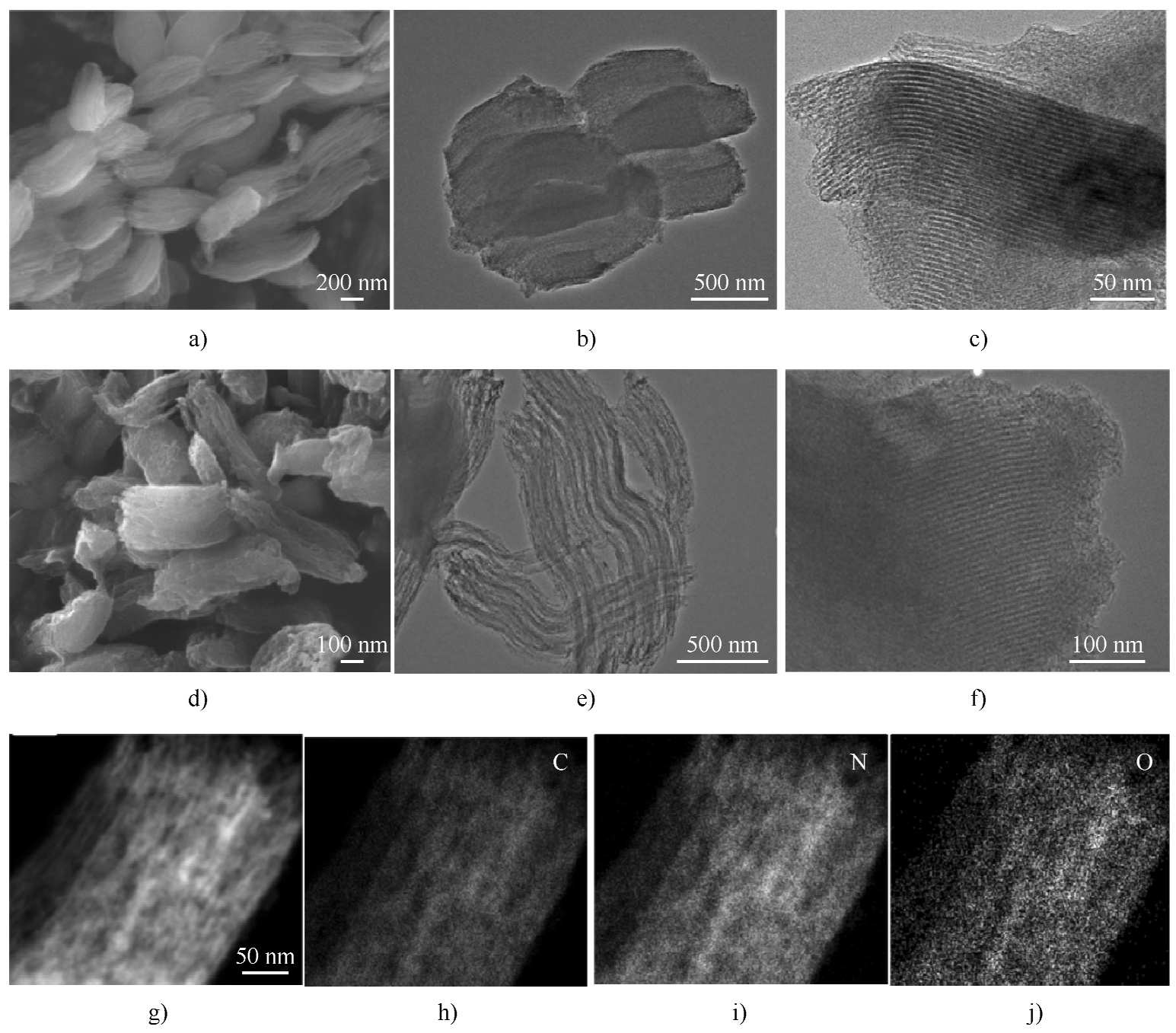 图3-18 a)CMK-3和d)NC-700的SEM图;b)、c)CMK-3和e)、f)NC-700的TEM图;g)~j)C、N、O的高清图谱