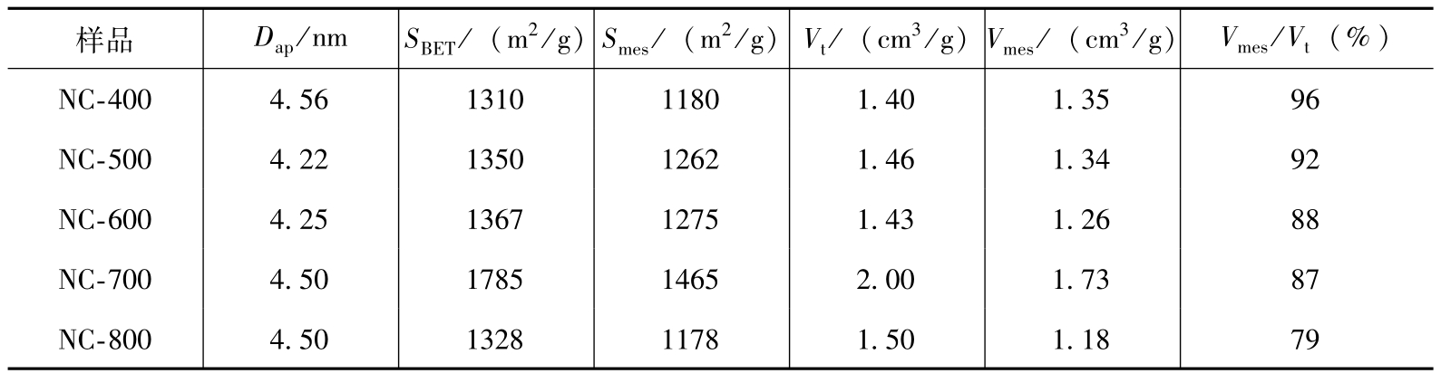 2)氮掺杂有序介孔碳(NC-T)的合成:取一定量有序介孔碳CMK-3置于刚玉舟中,放置在水平管式炉中,在20%的氨氩混合气氛围中分别在400~800℃下煅烧5h,加热速率为5℃/min,降温后取出,得到氮掺杂有序介孔碳材料NC-T(T代表煅烧温度)。