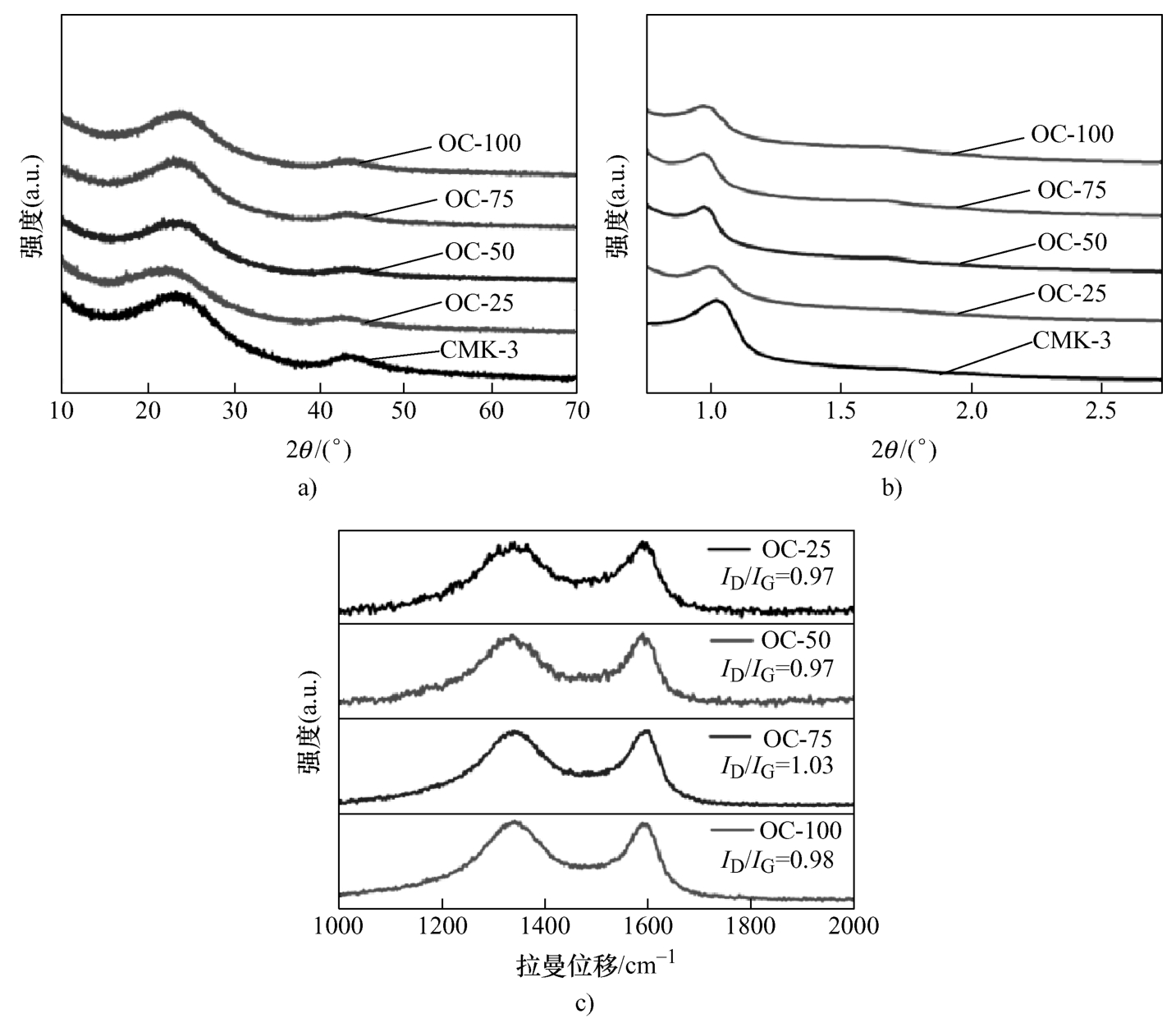 图3-5 所制备的CMK-3和OC-X的a)XRD图谱和b)小角XRD图谱;c)制备的OC-X的拉曼图谱