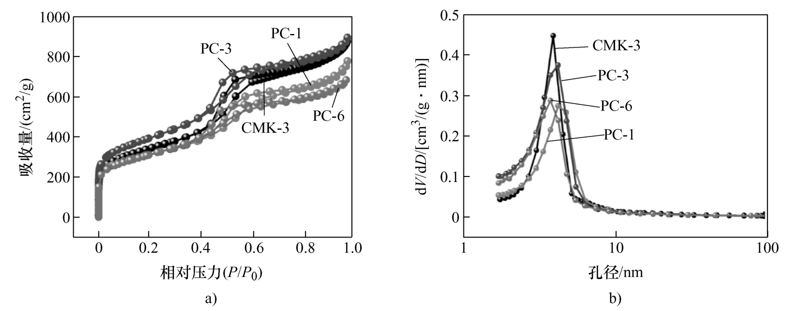 图3-14 a)CMK-3和PC-X的氮气吸脱附曲线;b)CMK-3和PC-X的孔径分布图