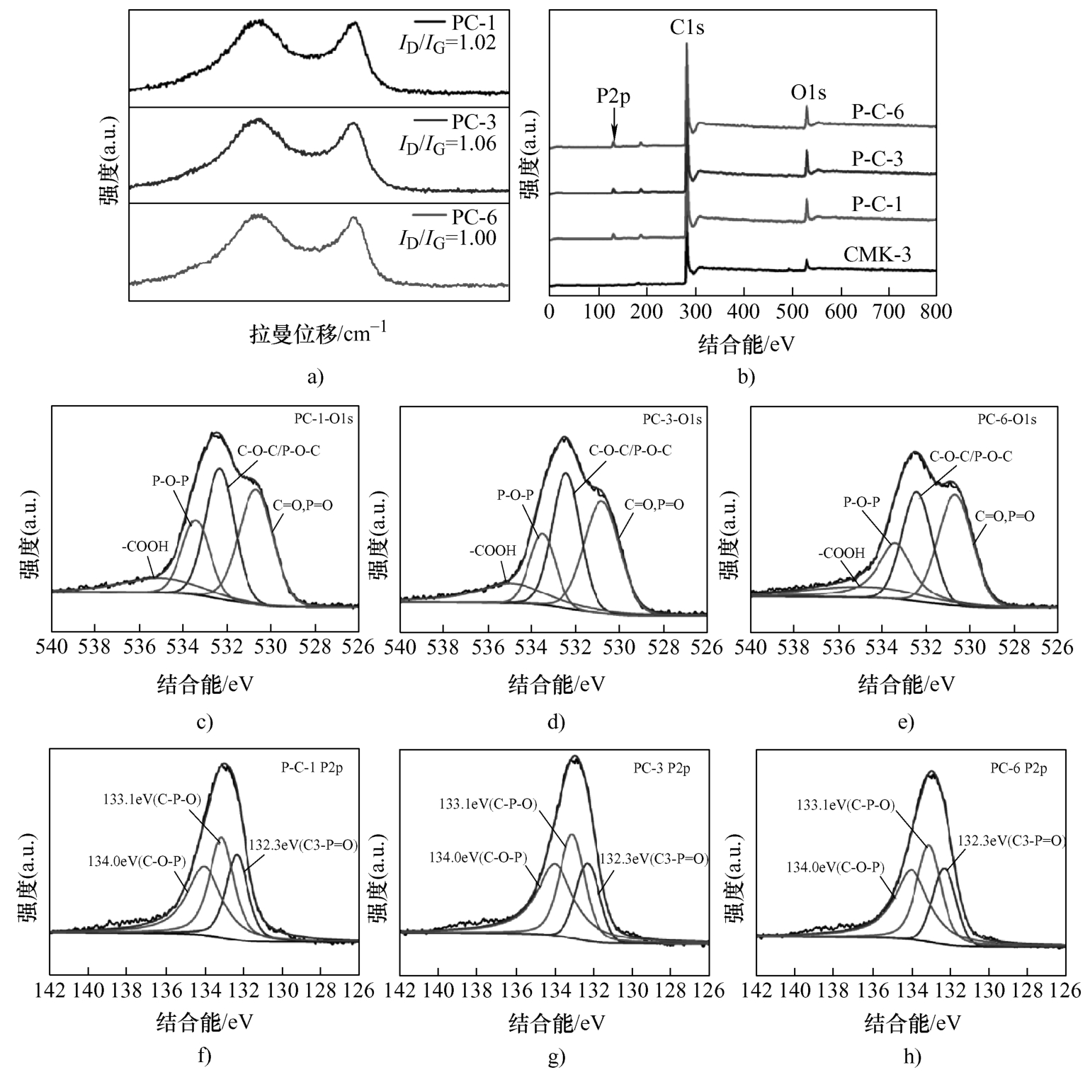 图3-13 a)所制备的PC-X的拉曼图谱;b)CMK-3和PC-X的XPS全谱;c)~e)PC-X中O1s的高分辨XPS图谱;f)~h)PC-X中P2p的高分辨XPS图谱