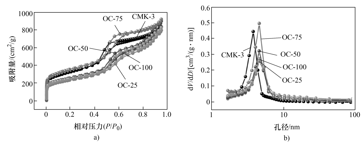 图3-6 a)CMK-3和OC-X的氮气吸脱附曲线;b)CMK-3和OC-X的孔径分布图
