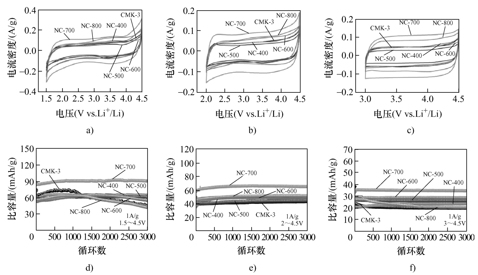 首先将氨气热解制备的氮原子掺杂的碳材料用于锂离子电容器的正极材料来研究其电化学性能的变化。图3-22a~c所示为在不同的电压区间下材料进行了循环伏安测试结果,扫描速率为1mV/s,分别在电压区间为1.3~20.5V、2~4.5V和3~4.5V时,不同材料的测试曲线都保持着类矩形的形状,说明当作为锂离子电容器的正极时,材料有着良好的双电层电容行为;而且尽管选取的电压区间不同,但NC-700均有着最大的扫描面积,说明其具有最好的电容特性。图3-22d~f所示为所制备样品的恒流充放电测试曲线,依旧在不同的电压区间下进行测试,在1A/g的电流密度下,材料均有着稳定的电容特性,循环3000圈后所有的材料均保持着较高的电容保持率,而NC-700的比电容明显高于其他材料,与掺杂前的有序介孔碳材料CMK-3相比,其比容量在不同的电压区间下均有50%~60%的提升,与循环伏安测试结果保持一致。通过氨气热解对有序介孔碳进行氮原子掺杂的过程中,良好地保持了有序介孔碳材料短程有序的介孔结构,从而继承了其稳定的电化学性能。另一方面,高含量的氮可以提高电解液在介孔孔隙中的润湿性,这有助于加速离子的迁移,此外,氮掺杂对碳材料在有机电解质中电容的增加有一定的促进作用。