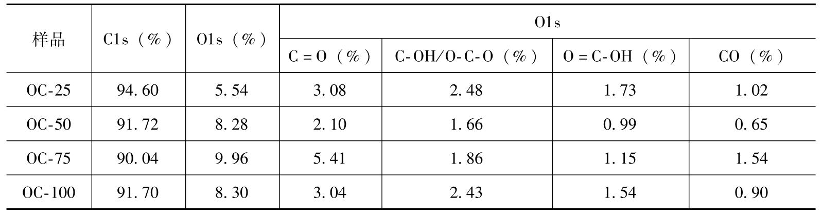 图3-6所示为对样品进行的比表面积和孔径分布的表征结果。由图3-6a可知,所测样品的氮气吸脱附等温线均为Ⅳ型等温线,且相对压力在0.6附近形成了明显的H4型回滞环,表明所测样品均具有丰富的介孔结构。由BET计算公式可得当有序介孔碳CMK-3在H 2 O 2 体积浓度为75%的溶液中进行氧官能化处理时,得到的样品OC-75有着最高的比表面积,可达1240m 2 /g,平均孔径约为4.7nm,介孔孔容为1.31cm 3 /g,占材料总孔容的89%。与有序介孔碳CMK-3的比表面积1208m 2 /g相比,当H 2 O 2 体积浓度大于75%时,OC-100的比表面积减少至842m 2 /g,表明过高的氧化浓度在一定程度上会破坏有序介孔碳的孔道结构,使相邻的孔道发生联通现象,所以其孔径增大,孔容也相对减小。图3-6b的孔径分布曲线表明所测材料的孔径分布集中,孔道均匀,平均孔径主要在3~50nm之间,进一步证明了稳定介孔结构的存在。