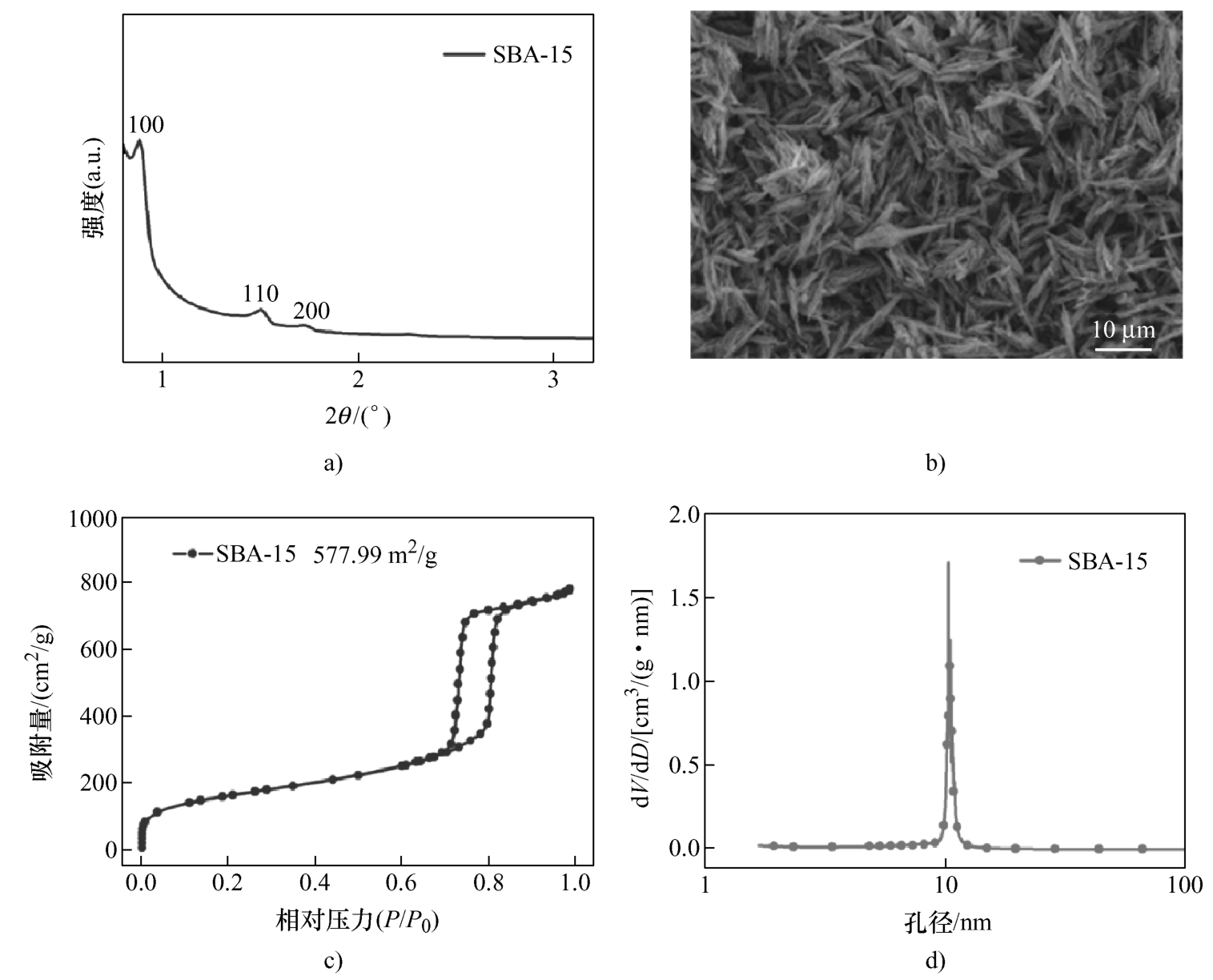 图3-4 a)SBA-15的小角XRD图谱;b)SBA-15的SEM图;c)SBA-15的氮气吸脱附曲线;d)SBA-15的孔径分布图
