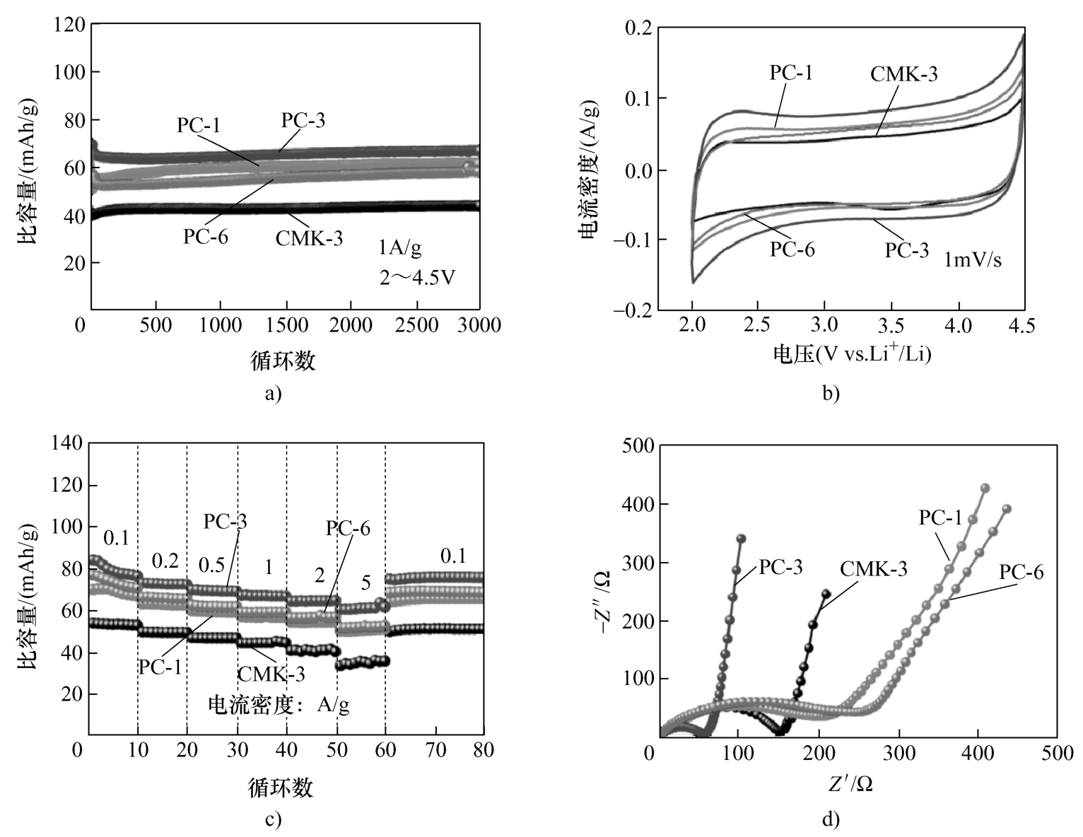 图3-15 a)CMK-3和PC-X在1A/g电流密度下的循环特性曲线;b)CMK-3和PC-X在1mV/s的扫描速率下的循环伏安曲线;c)CMK-3和PC-X在不同电流密度下的倍率性能曲线;d)CMK-3和PC-X交流阻抗图