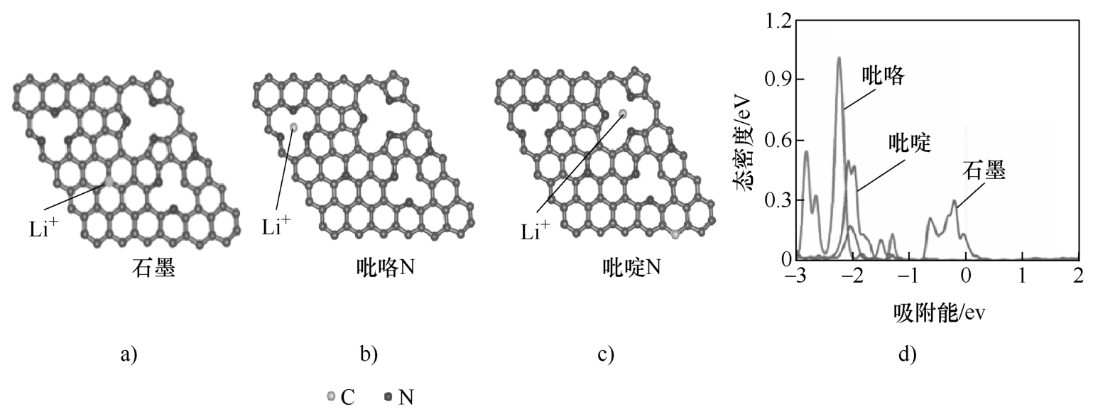 图3-21 基于第一性原理计算的锂离子在a)石墨b)吡咯N和c)吡啶N构型的吸附作用及其d)相应的态密度