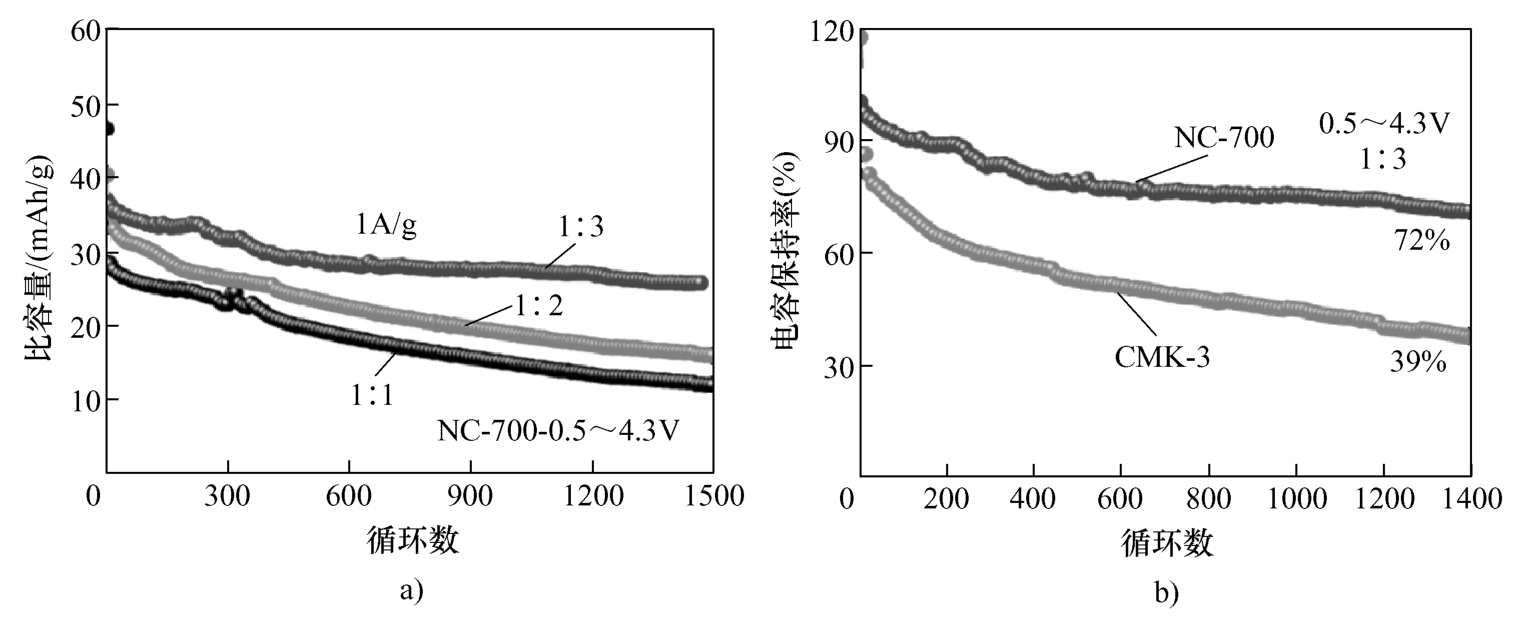 图3-27 a)采用NC-700同时作为正负极材料组装的不同质量比(1:1、1:2和1:3)的锂离子电容器的循环性能图;b)在正负极质量比为1:3时分别将NC-700、CMK-3作为电极材料组装的锂离子电容器的电容保持率性能图