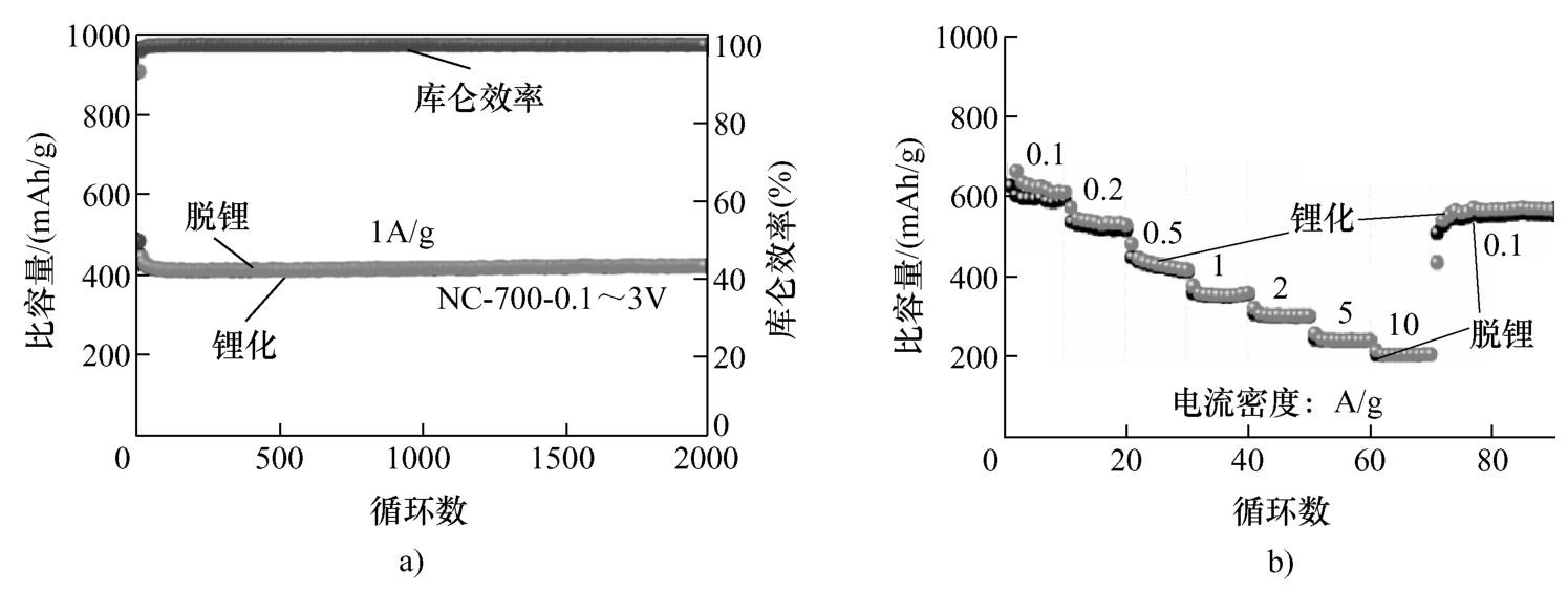 图3-25 a)NC-700电极材料在1A/g的电流密度下的长循环性能;b)NC-700在不同电流密度下的倍率性能图