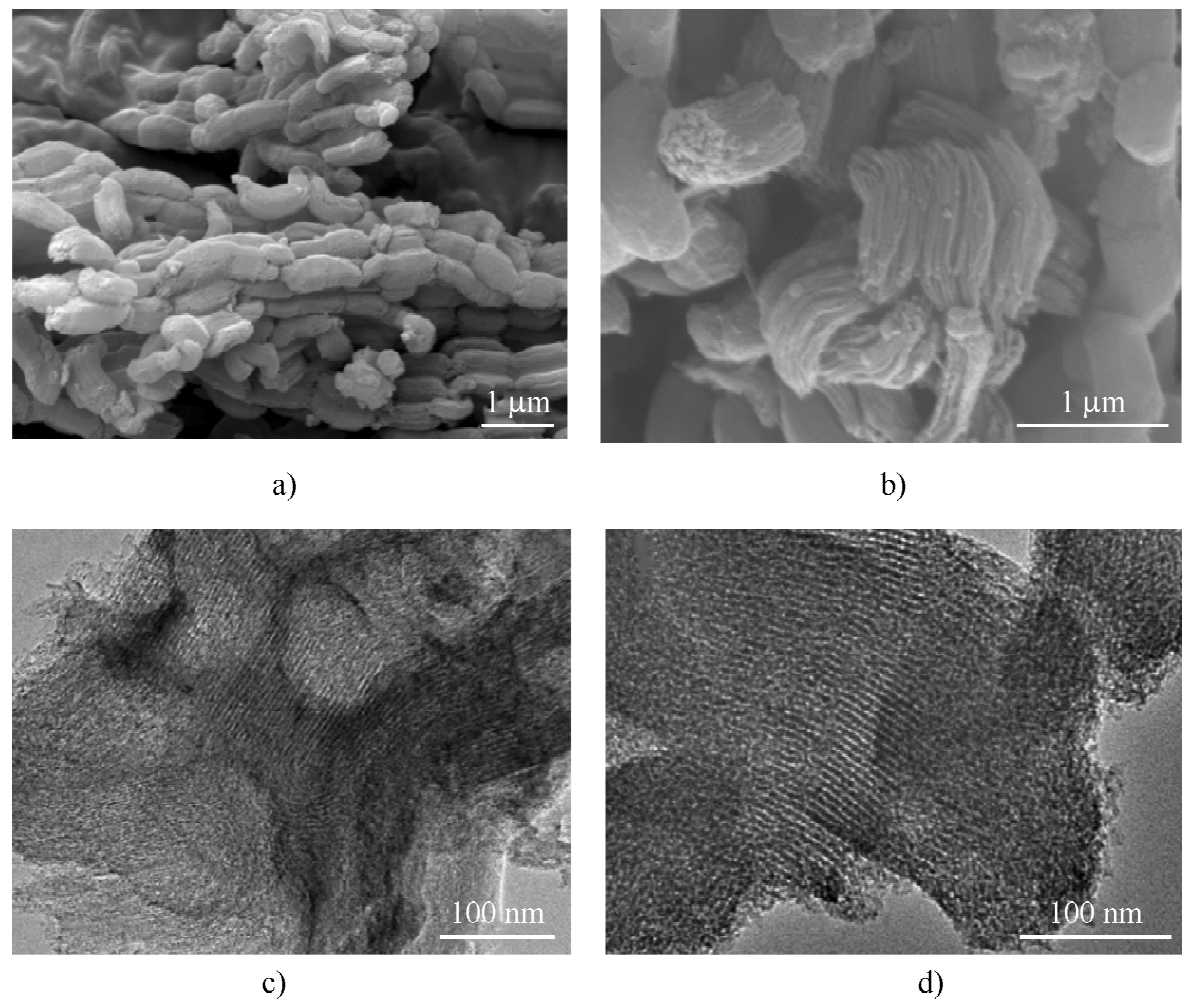 图3-7 a)CMK-3的SEM图;b)OC-75的SEM图;c)CMK-3的TEM图;d)OC-75的TEM图