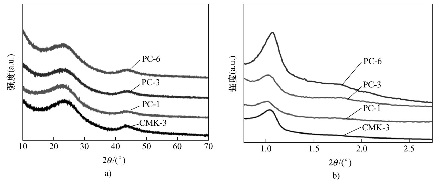 图3-11 所制备的CMK-3和PC-X的a)XRD图谱和b)小角XRD图谱