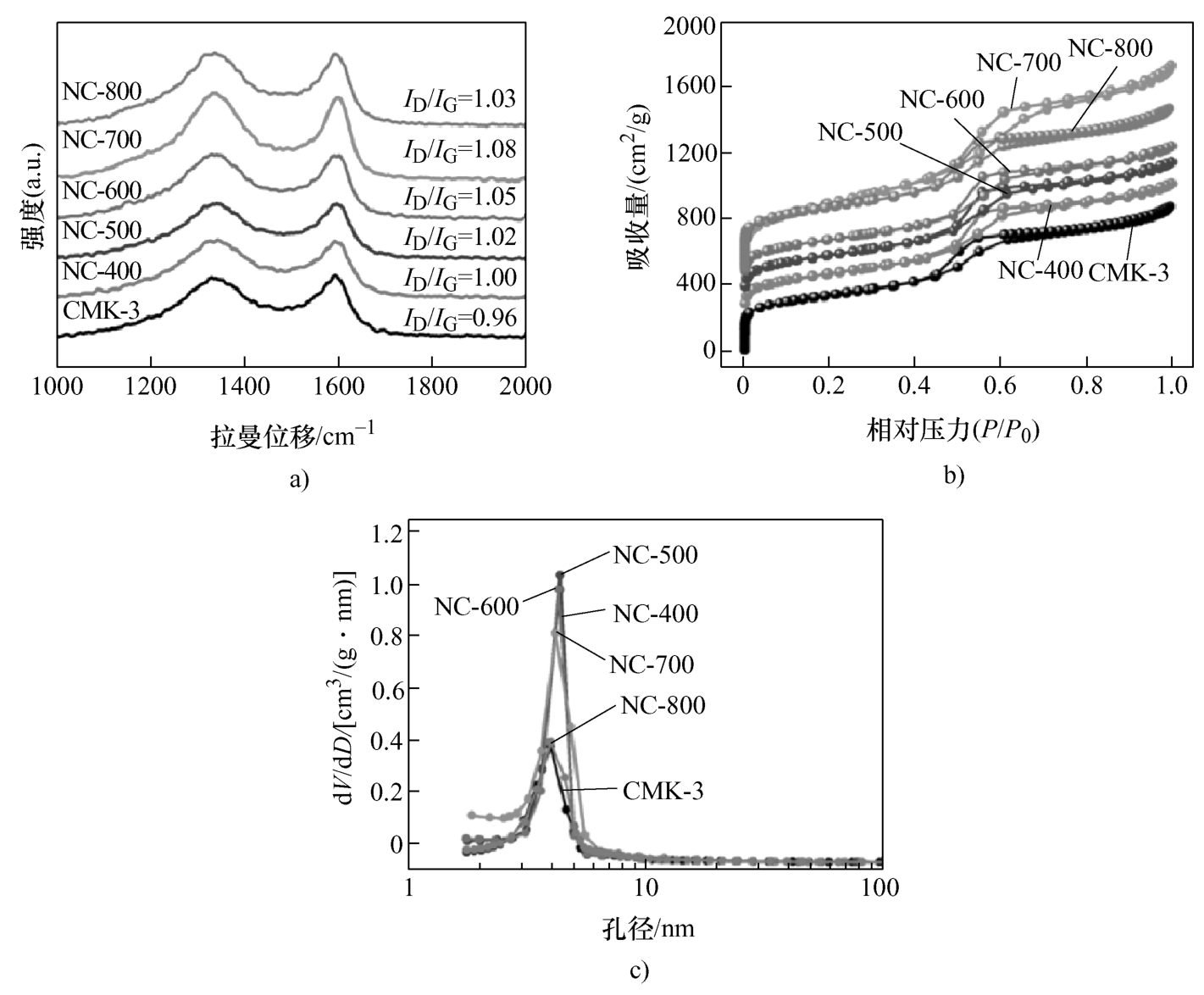 图3-19 a)所制备的CMK-3和NC-T的拉曼图谱;b)CMK-3和NC-T的氮气吸脱附曲线;c)CMK-3和NC-T的孔径分布图
