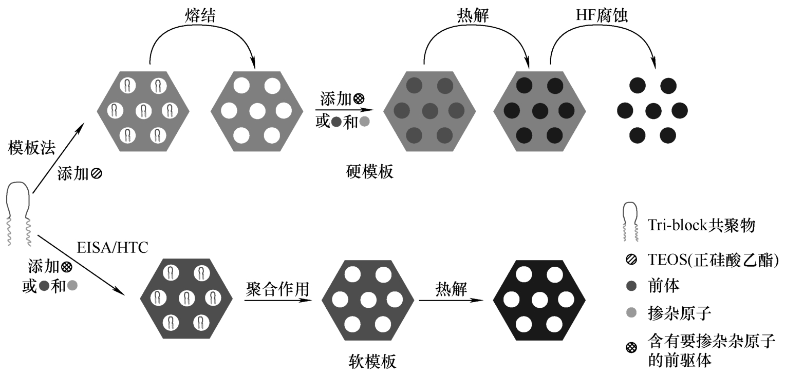 有序介孔碳主要通过模板法进行合成,利用模板剂自身结构的空间限域作用,可以高效地合成不同孔径的有序介孔碳,也会较好地复制出模板剂高度稳定有序的结构。有序介孔碳早期的合成采用硬模板法,通常要将孔道分布均匀且热稳定性好的刚性材料用作模板,通过液相浸渍等方法将前驱体置于模板中,通过模板的限域作用使得前驱体在模板中反应后完整地复制出其结构。硬模板法的合成方法可简要概括为以下几步:1)制备孔道规整均匀,热稳定性好的硅基分子筛作为硬模板剂;2)选择合适的碳源作为前驱体填充到模板的孔道内形成复合材料;3)将上述复合材料进行高温热解碳化;4)高温碳化后的材料用HF或者NaOH水溶液进行洗涤,将模板去除。例如,Wang等 [27] 人采用褶皱孔氧化硅(WMS)为模板,蔗糖为碳前驱体,首次成功合成了褶皱介孔碳。这种碳材料不仅保持了WMS独特的径向褶皱结构,也打开了内部表面,从而增加了比表面积(1344m 2 /g),该碳材料将因其独特的径向褶皱孔隙结构在电化学储能和催化剂等领域得到广泛的应用。Wang等人选用介孔硅基材料(FDU-5)为模板剂,通过浸渍法制备有序3D介孔碳,首次探索了其作为锂离子电池负极材料的电化学性能。所制备的C-FDU-5孔径均匀,比表面积为750m 2 /g。C-FDU-5作为一种新型纳米材料,具有比活性炭更优异的容量特性,并可在大电流下稳定地充放电。硬模板法在合成有序介孔碳的过程中需要考虑诸多的因素,例如:模板是否具有良好的热稳定性、前驱体在模板中的浸润效果和在模板孔道中的注入量是否可控等;再者,其合成过程的复杂性使其产率很低,步骤之间的相关联性太强,在实际使用中受到众多限制,也不利于工业上大规模制备。