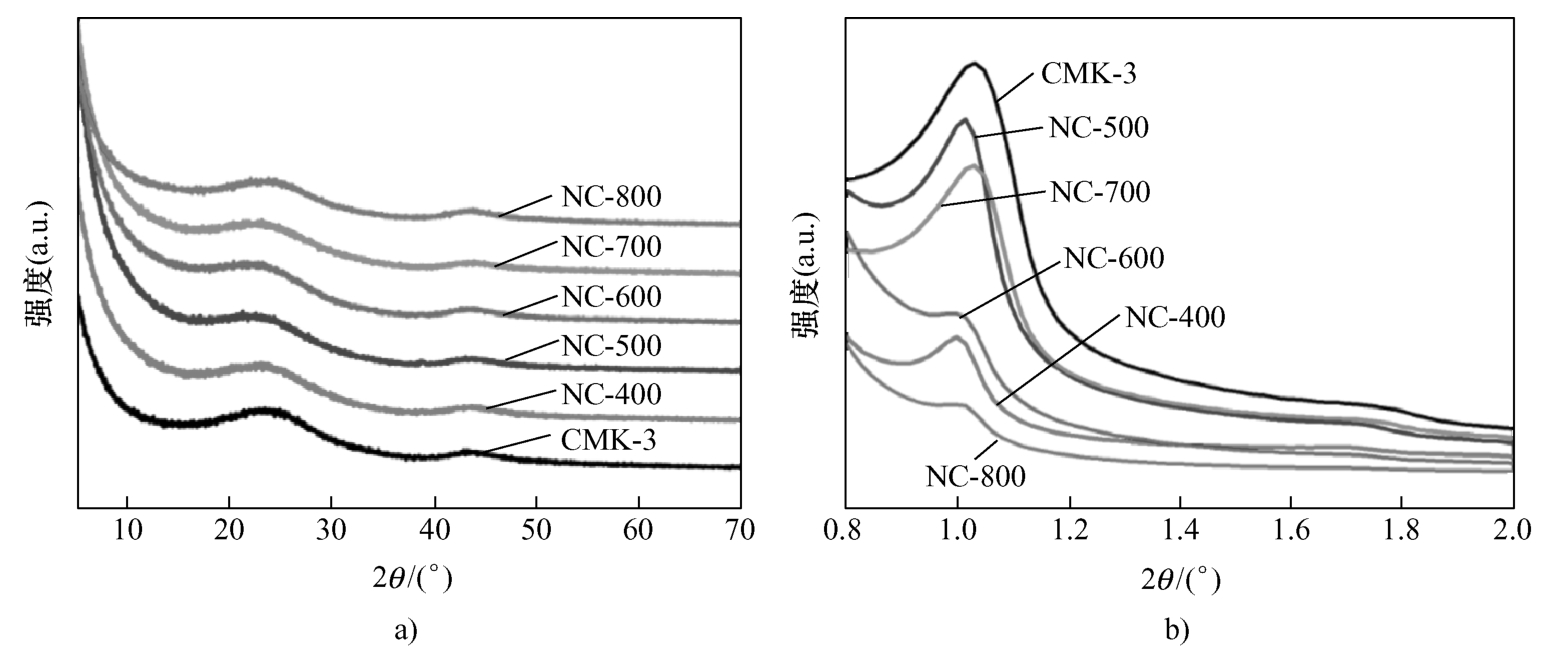 图3-17 所制备的CMK-3和NC-X的a)XRD图谱和b)小角XRD图谱