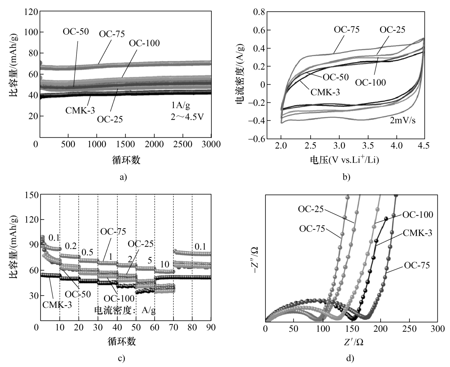 图3-9 a)CMK-3和OC-X在1A/g电流密度下的循环特性曲线;b)CMK-3和OC-X在2mV/s的扫描速率下的循环伏安测试曲线;c)CMK-3和OC-X在不同电流密度下的倍率性能曲线;d)CMK-3和OC-X的交流阻抗图