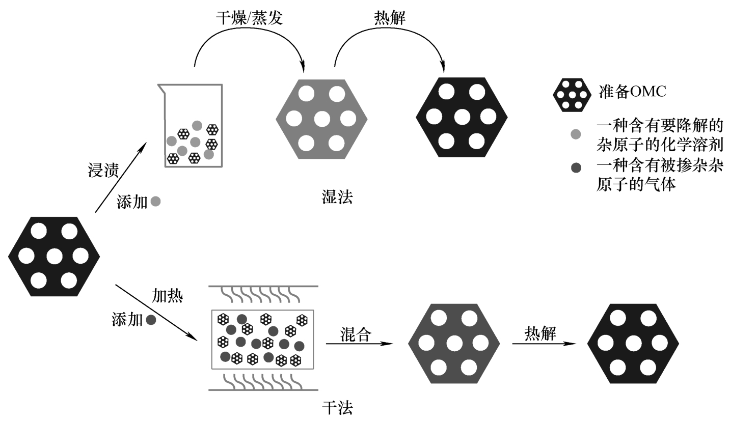 后处理法则为对预先准备的介孔碳进行一系列的改性。在后处理法中,杂原子通过氧化反应、热聚合反应或置换反应被掺杂进有序介孔碳中,但如何防止有序介孔碳材料的有序结构在后处理过程中被破坏成为该方法关注的重点;另外,如何将杂原子嵌入材料整体而不只是表面也非常重要。图3-3所示为后处理法的合成过程,后处理法可分为干性处理法和湿性处理法,干性处理法是将有序介孔碳置于含有杂原子的惰性气体环境中,在高温下反应掺杂而不使用任何溶剂。一般采用氨气作为氮掺杂气体制备氮掺杂有序介孔碳,例如,Dai等 [31] 人在950~1050℃的NH 3 气氛下对二维六角结构的有序介孔碳进行热处理合成了氮掺杂有序介孔碳,与传统的微孔碳相比,嵌入在介孔壁上的微孔更容易被气体活化分子获取,从而使掺杂过程更加高效,且官能化位点分布均匀。结果表明,氮对氧的取代和氮基自由基对碳骨架的腐蚀是氮物种形成的主要原因。对于湿性处理法,有序介孔碳通常在含杂原子的溶液中浸渍一段时间,然后进行干燥和高温处理。例如,Wu等 [32] 人将有序介孔碳与三聚氰胺以1:1.5的质量比研磨混合后置于20mL甲醇溶液中蒸发得到粉末混合物,然后在500~900℃下进行高温热解,得到N掺杂的介孔碳材料。