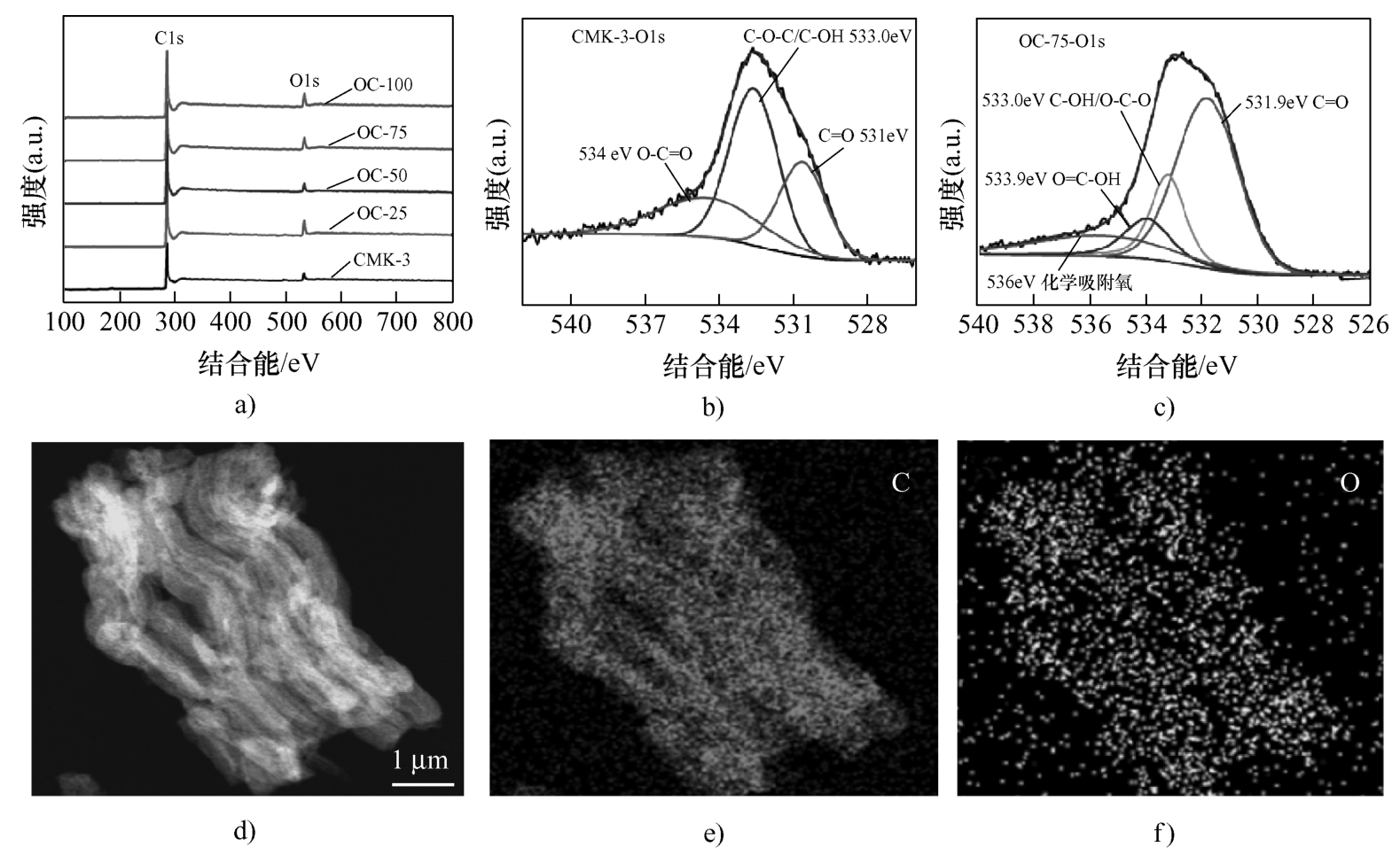 图3-8 a)CMK-3和OC-X的XPS全谱;b)CMK-3和c)OC-75的O1s的高分辨XPS谱图;d)~f)C、O的高清图谱