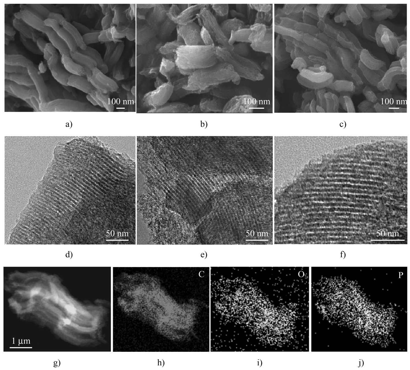 图3-12 a)PC-1,b)PC-3和c)PC-6的SEM图;d)PC-1,e)PC-3和f)PC-6的高分辨TEM图;g)~j)C、O、P的高清图谱